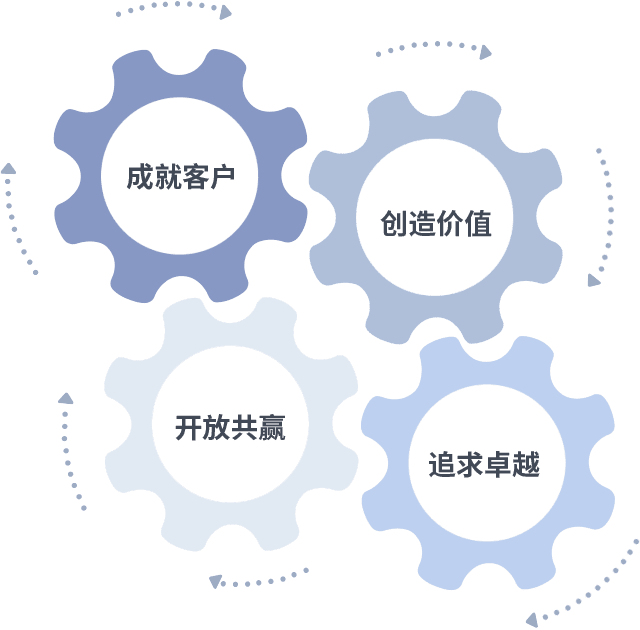 成就客户是一切决策的出发点,,,,创造价值是衡量所有工作的标准,,追求卓越是我们做事做人的态度,,,,开放共赢是我们的格局也是最终的结果。。。。价值观的齿轮环环相扣,,推动着组织里的每个人不断向前。。。